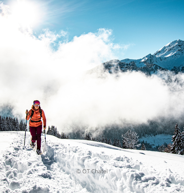 Pour ceux qui cherchent un rythme plus tranquille, les randonnées en raquettes offrent une expérience immersive dans la nature. Châtel et ses environs disposent de nombreux itinéraires balisés, adaptés à tous les niveaux, permettant de découvrir des paysages préservés et des points de vue exceptionnels sur les montagnes et les vallées.